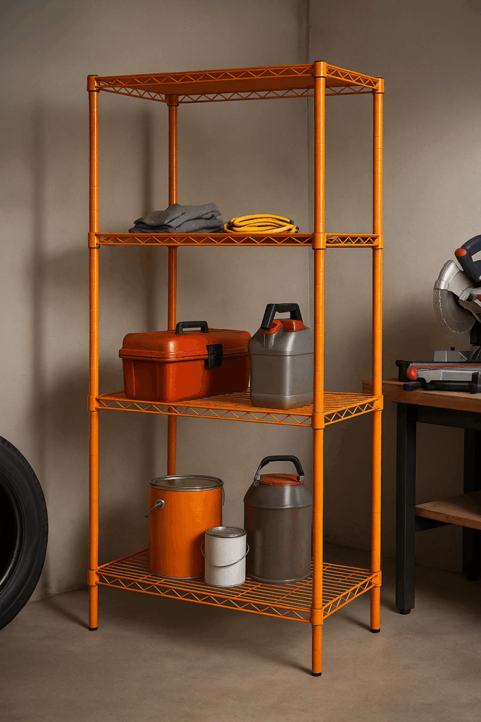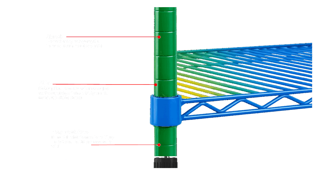 Każdy słupek posiada rowki co 2,5 cm, w które wsuwasz plastikowe klipsy pozycjonujące. Na nich opierają się półki – wystarczy je docisnąć, by całość była stabilna i gotowa do pracy.
